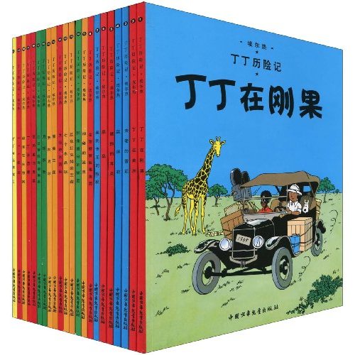 《丁丁历险记》包括:《丁丁在刚果》、《丁丁在美洲》、《法老的雪茄》、《蓝莲花》、《破损的耳朵》、《黑岛》、《奥托卡式的权杖》、《金钳螃蟹贩毒集团》、《神秘的流星》、《独角兽号的秘密》、《红色拉克姆的宝藏》、《七个水晶球》、《太阳神的囚徒》、《黑金之国》、《奔向月球》、《月球探险》、《向葵教授绑架案》、《货舱里的黑幕》、《丁丁在西藏》、《绿宝石矢窃案》、《714航班》、《丁丁与丛林战士》。
