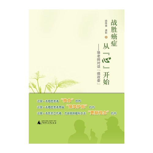 本书通过两位重量级“老癌”——骆降喜老师和唐影“政委” 的对话,向世人表明:癌症只不过是一种慢性病而已,并没有人们想象的那么可怕;慢性病治疗的主体是患者本人,“天行健,君子以自强不息”,患者自身的努力起决定作用;癌细胞虽然长在身上,但癌症的根却在“心”上。因此,癌症的治疗必须从“心”开始,任何治疗的成功都无法弥补心理治疗的失败;“癌症群体组织”是历史发展的必然产物,是癌症康复不可多得的“特殊医疗资源”;当代医学最缺乏的是人文医学,如果不重视“人文关怀”并落到实处,企图通过单纯生物医学的手术、放疗、化疗等将癌细胞斩尽杀绝,不仅不现实,而且往往适得其反,得不偿失,甚至人财两空……癌症的治疗必须回归到理性的人道上来,“人比癌重要”,癌症治疗的终极目标是“生命至上”,尽可能地让患者活得有质量,活得更长久,活得实实在在“像个人样”,并且健康长寿,尽终其天年,度百岁乃去。