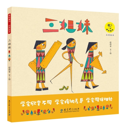 《三姐妹》是中央美术学院绘本工作室程雨菲极具创意的个性图画书创作。作者巧妙地将直尺、圆规和三角板化身为三姐妹,将小读者带入一个奇妙的大花园里,为他们讲述了一个引人思考的故事。故事中,大姐直尺、二姐圆规和妹妹三角板各自认为自己种的长方形、圆形和三角形的花是美的,并因此发生了激烈的争执,发展到筑起高墙谁也不肯理谁,结果她们却越来越不快乐。变成蝴蝶的毛毛虫像光一样启发了三姐妹,在它的帮助下,三姐妹认识到“方有方的美,圆有圆的妙,三角形有三角形的俏。多种美丽并存,世界才会更加丰富多彩”。因此三姐妹拆除石头围墙,三个花园合成了一个大花园,不同形状的花都种在了一起,三姐妹又能友好地相处了,她们重新感受到了快乐。蝴蝶们也很喜欢现在的大花园,都在三姐妹的花园里安了家。蝴蝶们从不同形状的花朵上,采到了同样甜美的蜜。