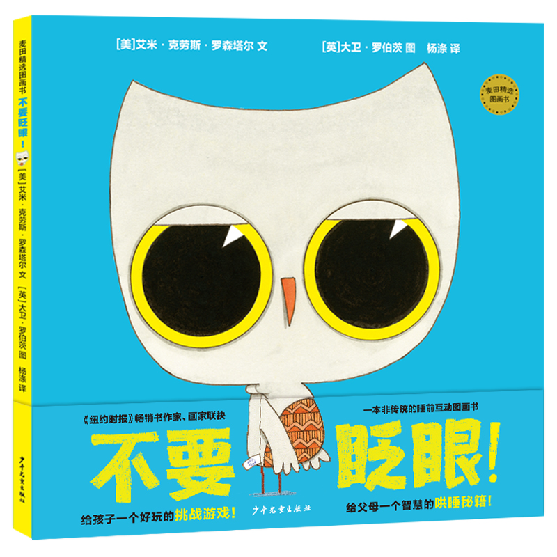 这本创意独特的互动图画书似乎是站在不愿意睡觉的孩子一边,但它却是一本伪装的“睡前书”。主人公小猫头鹰还提供了各种“不眨眼”的帮助:瞪大眼睛盯着看、眯着眼看、用手撑住眼皮、一次性眨眼眨个够……但它的最终目的是让孩子睡觉哦!