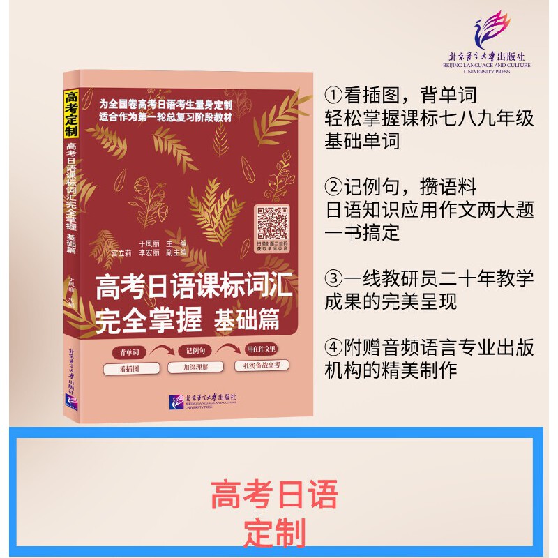 本书特色一是给每个汉字词都标注了读音,减轻了学生学习 负担;特色二是每个词的例句或者选自历年真题,或者选自日本文献,内容贴近中学生活,便于学生仿写和背诵;特色三是每个词都配有一幅插图,这既增加了内容的趣味性,也便于学生理解单词的使用场景;特色四是所有词语都分为理解词汇和掌握词汇,便于学生分类记忆;特色五是每个词配有录音